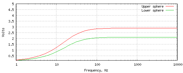 Create a test circuit with a resistor to ground from each sphere, representing the bias resistors of a differential front-end amplifier. The 5th pin of the sub-circuit is an input which sets the field strength. This is connected to a 1V AC source to represent a 1 V/m field in the model.