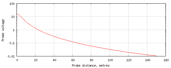 ngspice -b pwrline-test.spice > pwrline-test.outA simple shell script is easily employed to repeatedly run lcng and ngspice with a range of probe distances up to 150m. The results are plotted in the graph below.