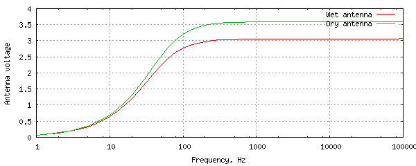 The corner frequency is about the same (50Hz) for wet and dry conditions, but the antenna effective height is affected. The antenna voltage above the corner frequency is 3.6V when dry and about 3.1V when wet. The incident field is 1V/m therefore these voltages directly give the effective antenna height.