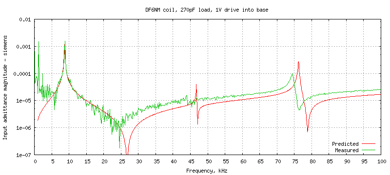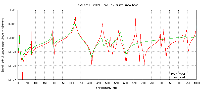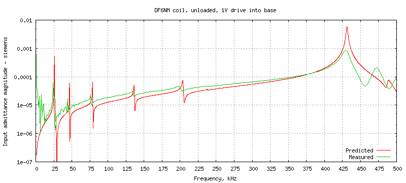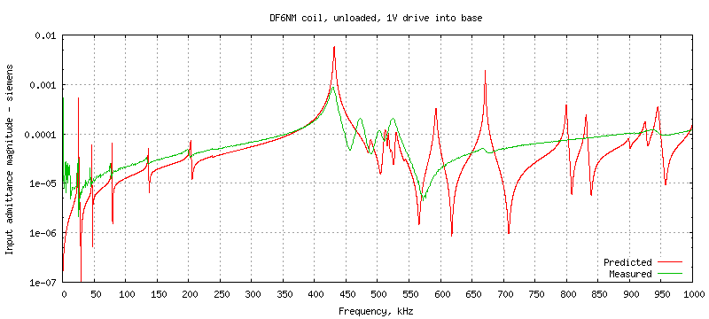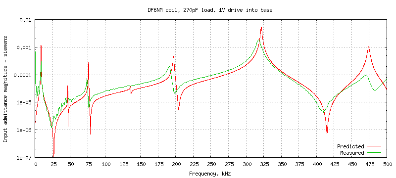 In this test the base of the coil is driven with 1V AC and the drive current is measured to produce an input admittance plot. The test circuit is df6nm_coil-unloaded.spice which contains
