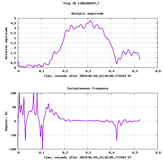 The initial Doppler here peaks at about +60Hz and decays roughly linearly over about 60mS. Most pings do not present an initial Doppler shift and only offer a small constant offset due to the low velocity drift of the ionised trail.