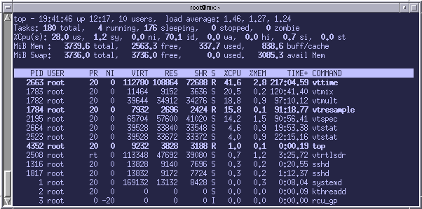 vtmult -f 7600 @timed | vtmix -c1,0,-j,0 | vtresample -r 1800 -- - ++pn,41768,f4where 'pn' is the hostname of my workstation and 41768 is some arbitrary TCP port number.