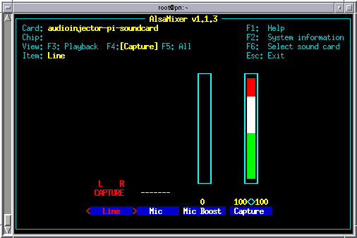Use the left-right arrows to highlight Line input and press SPACE to activate it. Move right to the Capture control and the PgUp/PgDn keys can then be used to set the input gain. Set the input gain slider to its maximum. Your settings are automatically saved, and will be retained across a reboot. The stereo audioinjector has an analog input gain control potentiometer on the card itself. Always run with that control at full gain.