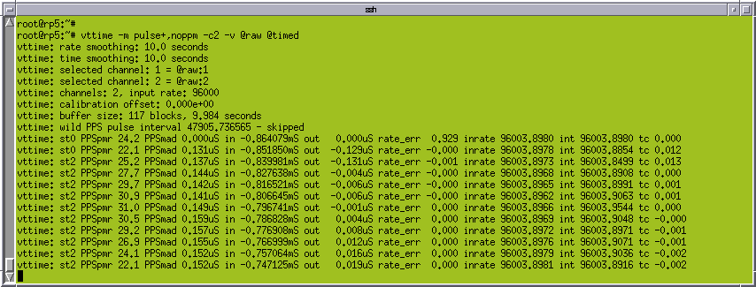 The -c option tells vttime which input channel the PPS is on. With the Octo card, channels 7 and 8 are empty and we don't want to waste CPU to resample these, so we explicitly select only the first six input channels.