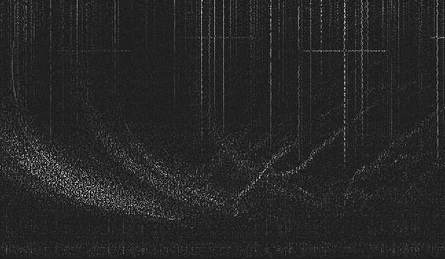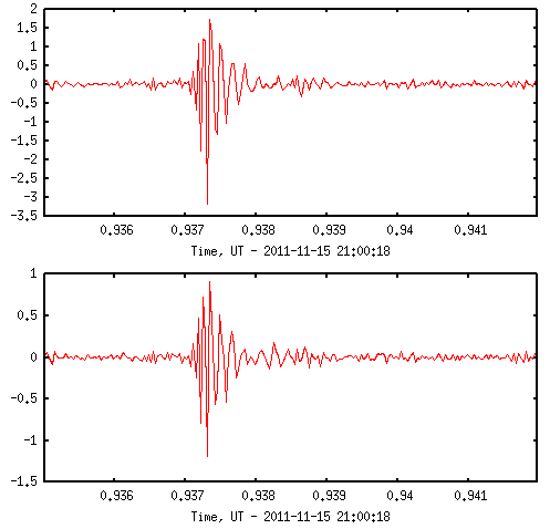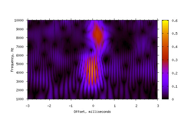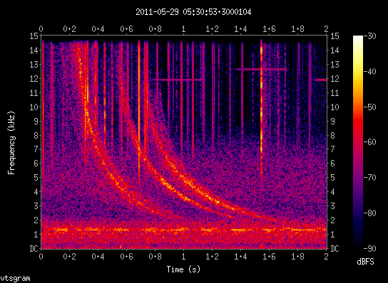 Equalising the phase of signals brought together from remote receivers is more difficult still. It requires a test source in which the test signal is synchronised to a time standard such as a PPS from a GPS. First the timestamping of the two sites must be set as carefully as possible via the c= parameter of vttime at both sites. There may be a residual systematic time difference which should be identified and corrected by a vtcat -a applied to one of the sources. The vtcmp program can again be used for these timestamp calibrations, in its -m cor mode of operation. This reports the cross-correlation between two channels. To confirm time alignment to within a fraction of a sample period it is necessary to upsample (vtresample) to a much higher sample rate before using vtcmp -m cor and fairly long averages should be taken. Once the time alignment of the two sites is reasonable, a phase comparison and correction can be made. It is probably necessary to repeat the time delay and phase correction steps iteratively, perhaps by first establishing a good time and phase alignment at a low test frequency and then working upwards through the range of interest to equalise the phase. A sanity check on the alignment between remote sites can be made by measuring arrival time differences of suitably placed distant MSK stations. vtcmp -m cor is a very good tool for ATD measurements. The image on the right shows arrival time differences of sferics and a whistler received at two sites.
