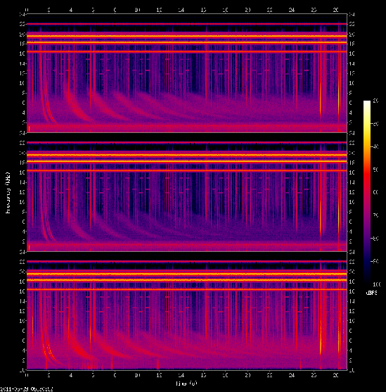 The spectrogram on the right was produced using vtmix to generate the three signals and was rendered by vtsgram. This whistler and its echo train was strongest in RH polarisation. The hiss is also RH polarised.