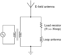 Correcting the phase response between co-located E-field probes and loop antennas is more difficult. A rough calibration can be performed by using distant sferics and MSK stations as described above. For more precise calibration, a test source can be arranged to produce both electric and magnetic near fields in phase with one another, as illustrated on the right. The load resistor must be rated to handle all the power from the signal source and its resistance must be much higher than the reactance of the test loop so that the loop current is in phase with the E-field antenna voltage. The test source is placed near enough to the receiving antennas to obtain a good signal in both fields. vtcmp -m pd360 or vtnspec can then be used to report the received phase difference.
