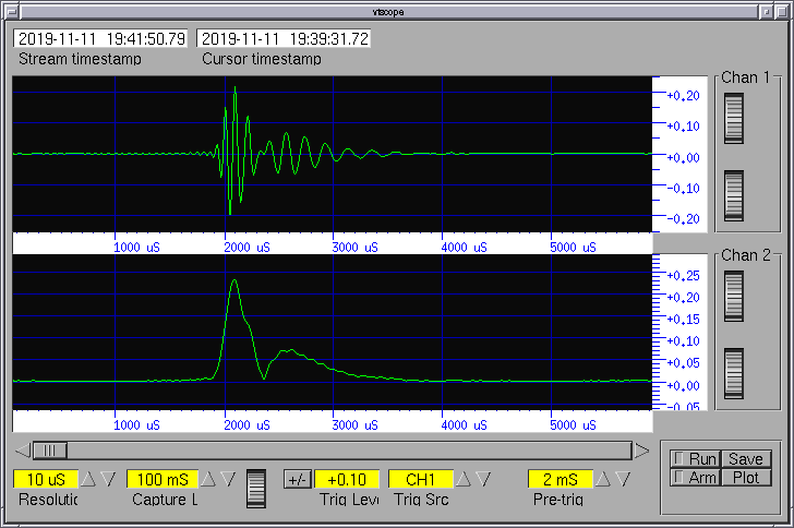 A most useful application for the analytic signal is to extract the envelope of a non-stationary signal. An example is the sferic waveform shown in the vtscope image on the right. Channel 1 is the original waveform and channel 2 is the magnitude of the analytic signal, obtained using vtam. The following command was used,
